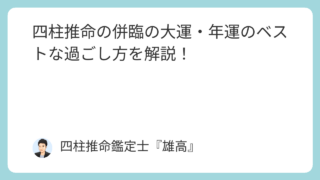 大運 飛躍するための忌神運の過ごし方とは!?(大運・年運) 忌神運は怖い時期ではありません。四柱推命で不運とされる時期の意味と、飛躍の準備期間としてのベストな過ごし方を解説。大運や年運で巡ってくる試練をチャンスに変え、次の好運気で大きくジャンプするための具体的なアクションプランを紹介します。 2025.12.06 大運